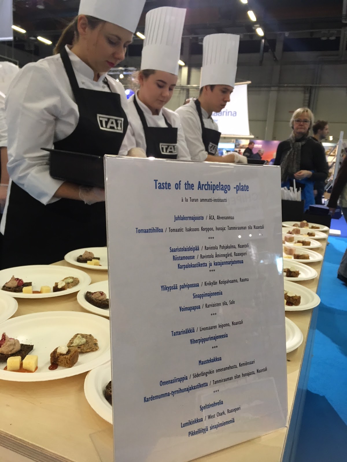 Saaristokunnat ja -kohteet olivat väsänneet hienon ja laajan yhteisosaston. Pääsin myös maistelemaan saaristolaislautasta, jossa oli tarjolla mm. ahvenanmaalaista juhlakermajuustoa korppoolaisista tomaateista tehdyn hillon kanssa, tattarinäkkiä viherpippurimajoneesilla ja maustekakkua omenasiirapin ja kardemumma-tyrnihunajakastikkeen kanssa. Ajoitus tarjoilulle oli loistava (olin juuri miettinyt tarvitsevani pientä välipalaa, kun kävelin suoraan jonoon) ja maku täydellisyyttä hipova.