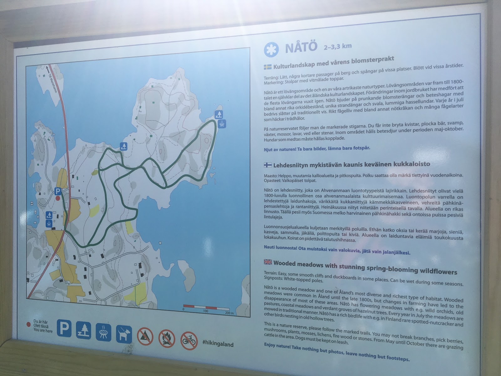 Visit Ålandin sivuilta löydät hyvän kartan alueelle. He kuvailevat sivuillaan reittiä seuraavasti: ”Luontopolun varrella on lehdestettyjä, laidunhakoja, värikkäitä kukkaniittyjä kämmekkäkasveineen, vehreitä pähkinäpensaslehtoja ja rantaniittyjä. Heinäkuussa niityt niitetään perinteisellä tavalla. Alueella on rikas linnusto.” Ilokseni huomasin myös, että alueen opasteet oli päivitetty uusiin. Visit Ålandilla on juuri nyt suuret projektit valleusreittien uudistuksien suhteen meneillään ja Nåtön polku on ainakin hyvin opastetuksi todettu. Suosittelen!